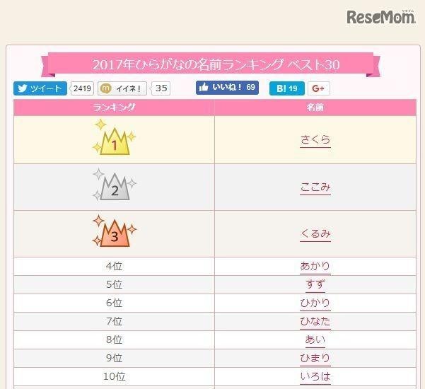 赤ちゃん名づけ 2018年 ひらがなの名前ランキングベスト30 人気